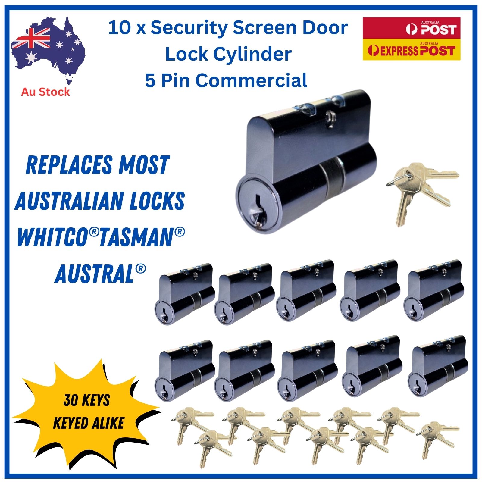 Bulk 10-pack of 5-pin euro-profile security door lock cylinders supplied keyed alike, 10 retaining screws, along with 30 chrome-plated keys. Designed for hinged and sliding (parrot beak) security screen doors. Ideal for trade, motels, caravan parks, and multi-door upgrades.
