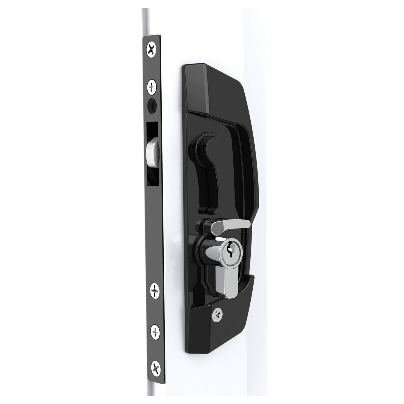 An anti-lift pin integrated into the striker plate helps prevent the door from being lifted out of its track. The lock is universal and reversible, making it suitable for left- or right-hand door configurations. Upgradeable to a triple lock . Finished in black for durability and corrosion resistance.
